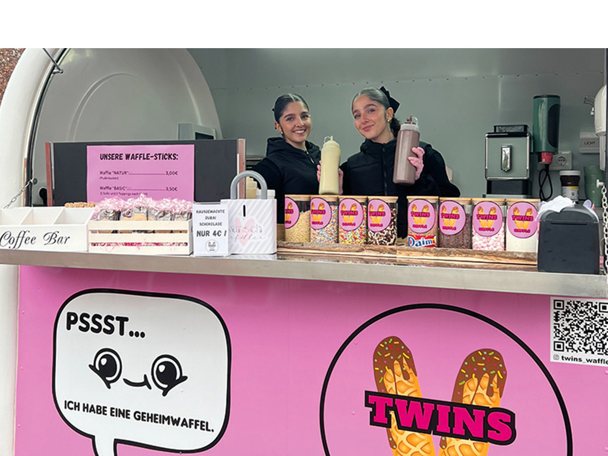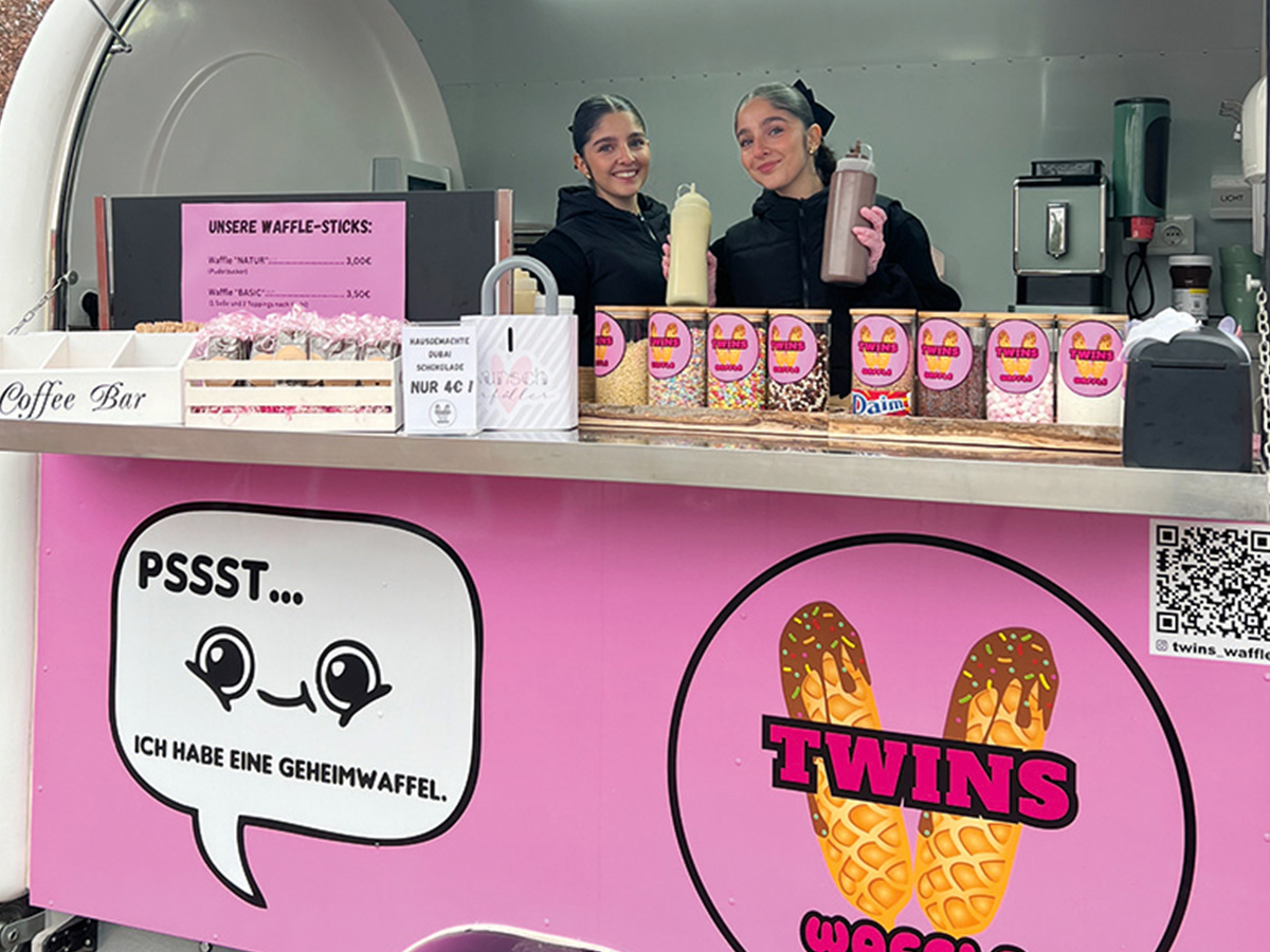 Mit der Idee, frische Waffeln am Stiel mit leckeren Soßen und verschiedenen Toppings anzubieten, haben sich die 18-jährigen Zwillinge Kayra und Kübra Torunlar 2024 als mobile Waffel-Caterer selbstständig gemacht. Mit ihrem pinken Foodtruck sind sie auf Events präsent und können für Feierlichkeiten gebucht werden.